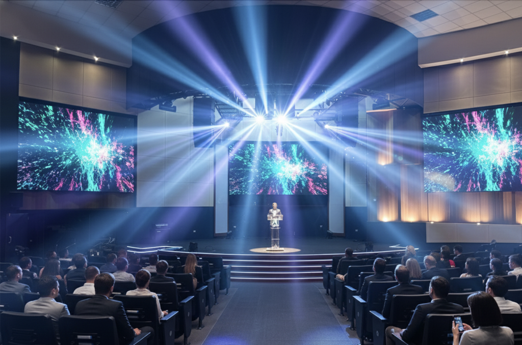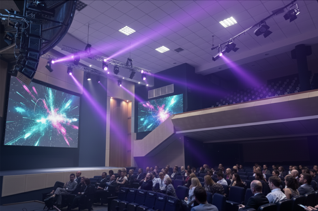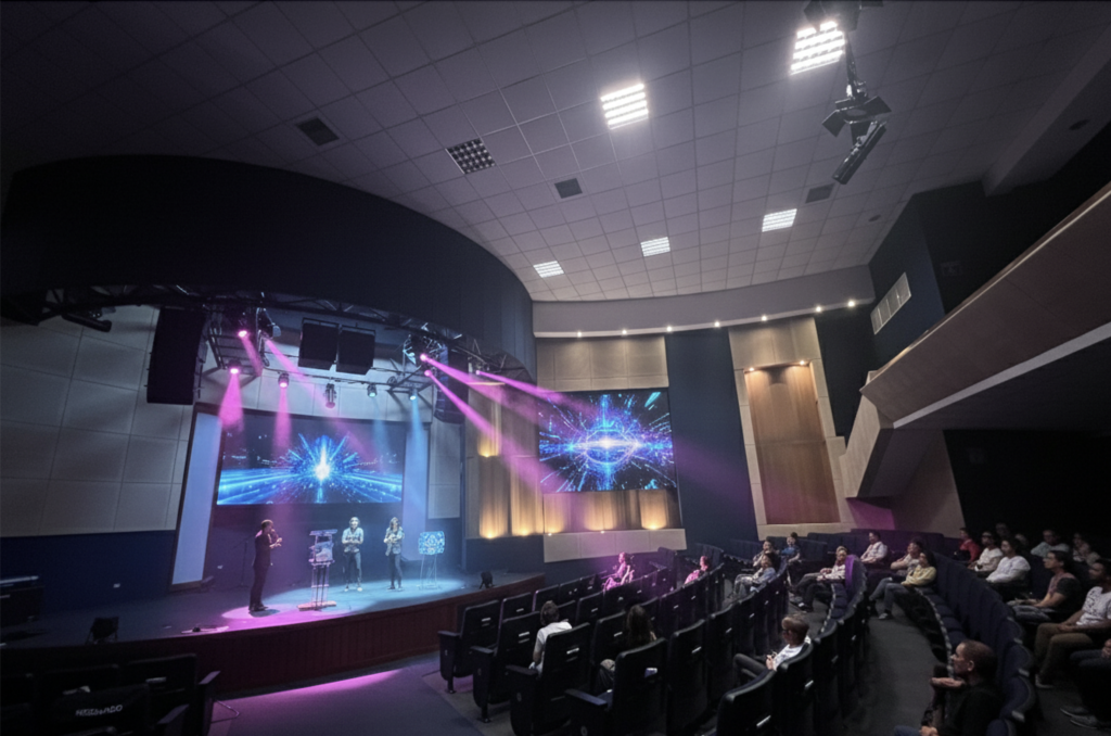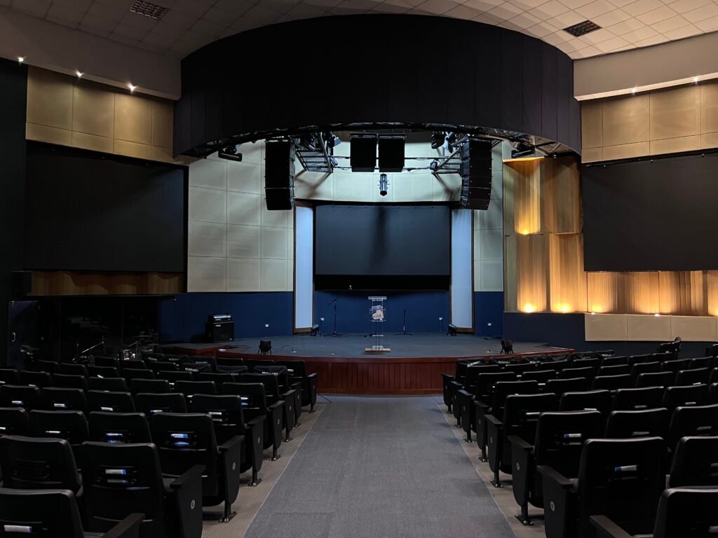 Proyecto de remodelación acústica del auditorio, desarrollado a partir de un análisis predictivo del tiempo de reverberación (RT) para definir la correcta ubicación de difusores numéricos, trampas resistivo-diafragmáticas, cielos rasos acústicos y materiales aislantes y absorbentes, con coeficientes NRC superiores a 0.75.