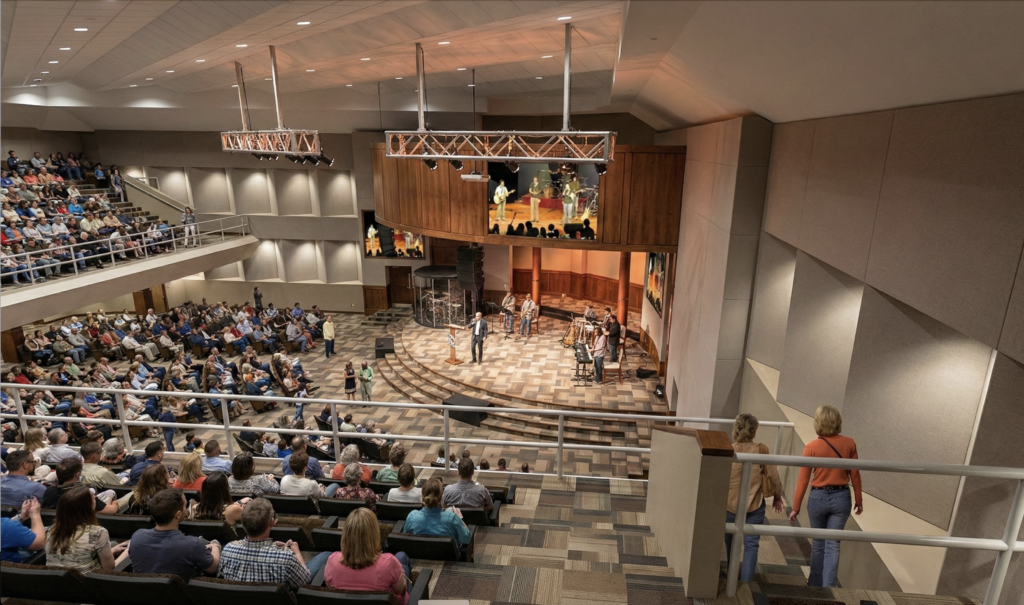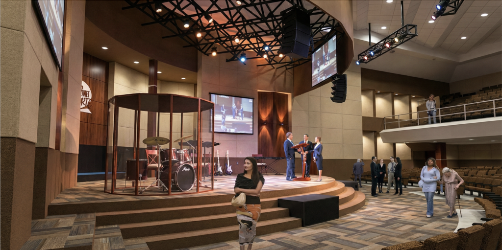 Diseño arquitectónico de la remodelación acústica del auditorio, incluyendo modelación predictiva de reverberación para definir propuestas de absorbentes, difusores, reflectores sonoros y materiales aislantes, garantizando un adecuado acondicionamiento y aislamiento acústico del espacio.